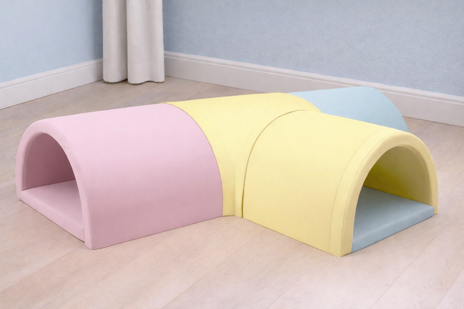 Tunelski komplet iz 4 mehkih modulov je zasnovan za zabavno, varno in razvojno bogato otroško igro. Posamezni elementi so med seboj povezani z ježki, kar zagotavlja stabilnost ter omogoča hitro sestavljanje in razstavljanje. Tunel otroka spodbuja k raziskovanju, krepi domišljijo, uri orientacijo v prostoru ter motivira k gibanju.